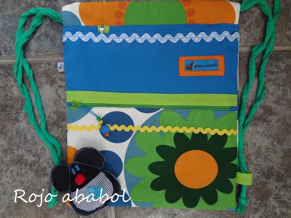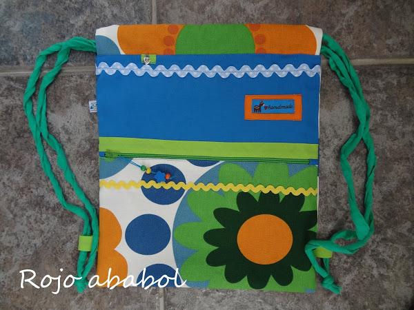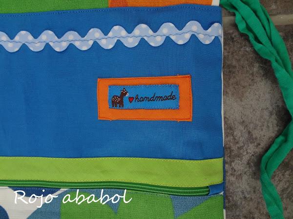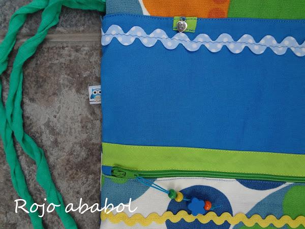 La segunda mochila en tonos azules y verdes, Etiqueta azul sobre bies naranja, zig zag topeado azul y bies verde para tapar la cremallera.