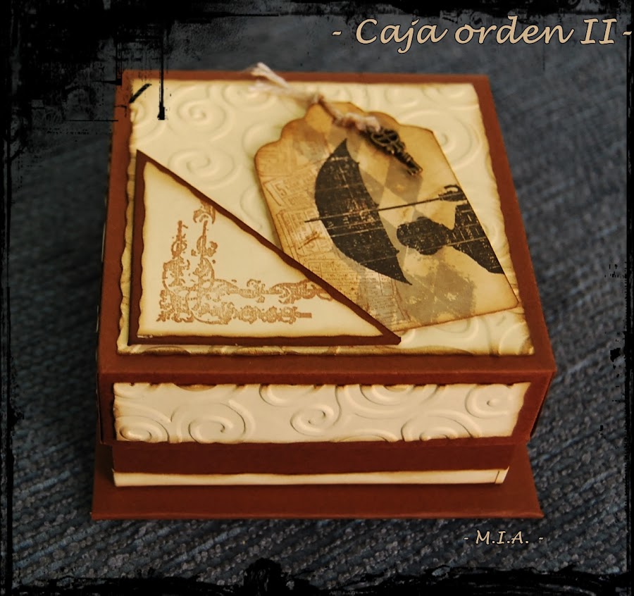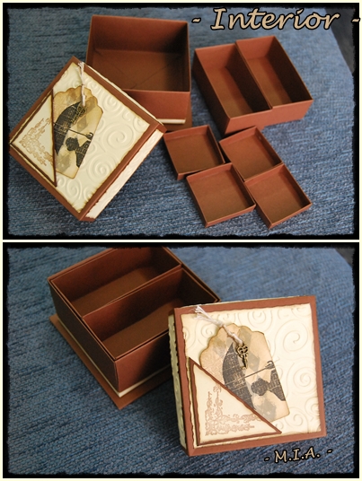 Como había un scrapero, en su honor hice otra caja más "masculina", sin flores, perlitas o lazos, sino usando sellos de Tim Holtz, un tag decorado y un pequeño charm de cobre.