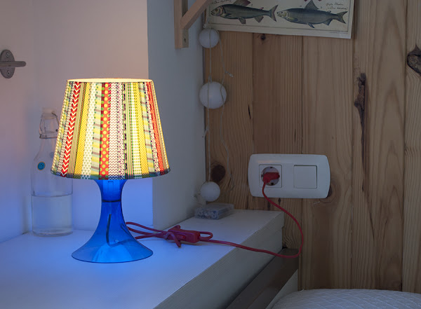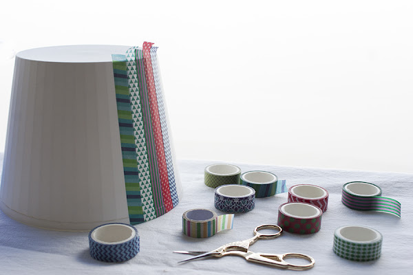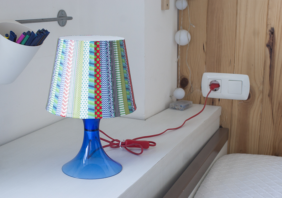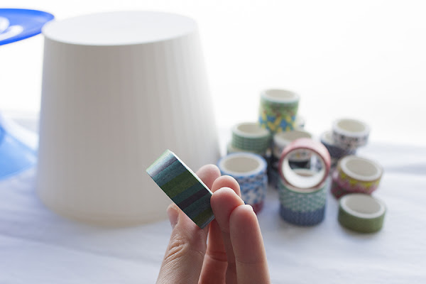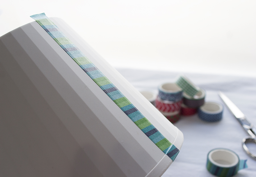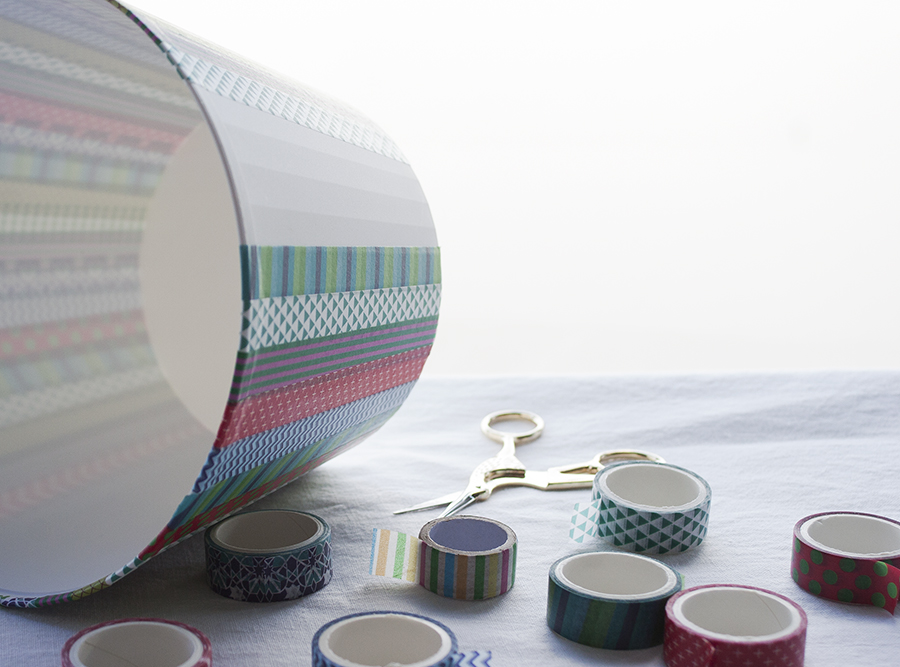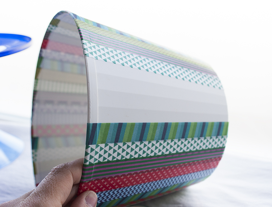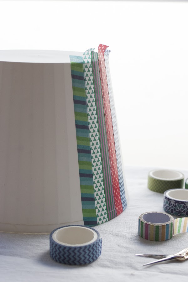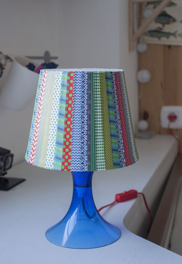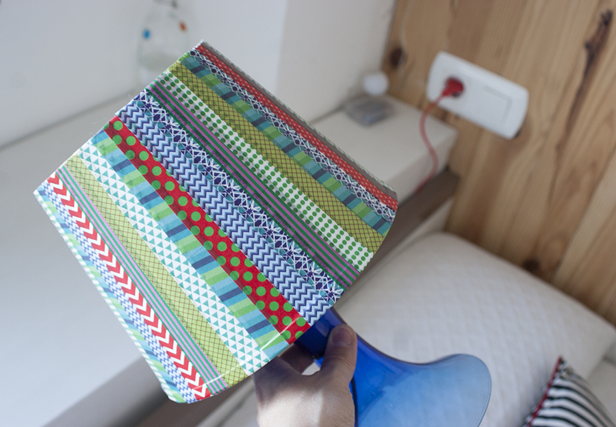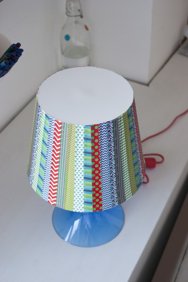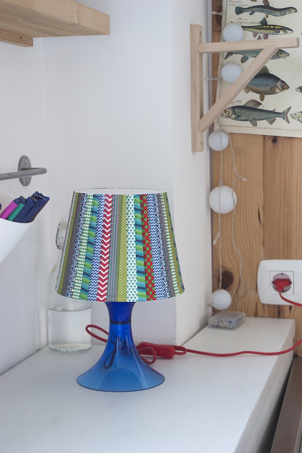 El proceso DIY es bien sencillo... Sólo se trata de ir pegando la cinta adhesiva a lo largo de la tulipa de la lámpara, que por cierto se quita y se pone con mucha facilidad, a presión.