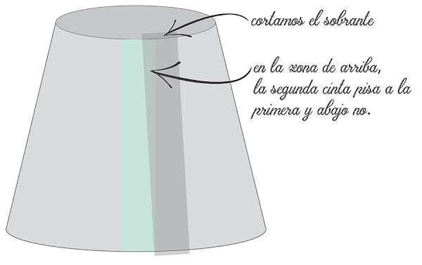 EL TRUCO: La tulipa tiene forma cónica, y por lo tanto el diámetro de su zona superior es menor a la inferior. Esto lo tenemos que tener en cuenta a la hora de pegar la cinta, a partir de la segunda. ¿Cómo? Debemos "pisar" la cinta en la zona superior, y ocupar todo el ancho de la cinta en la zona inferior. ¿Habéis entendido? A ver si con este dibujo lo vemos mejor ;)