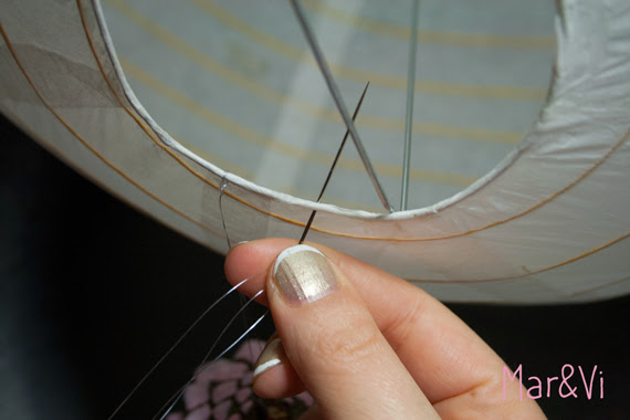 Enhebramos el hilo largo que nos ha quedado a una aguja, y lo pasamos por el borde de la pantalla, sujetándolo a la altura deseada con un nudo: