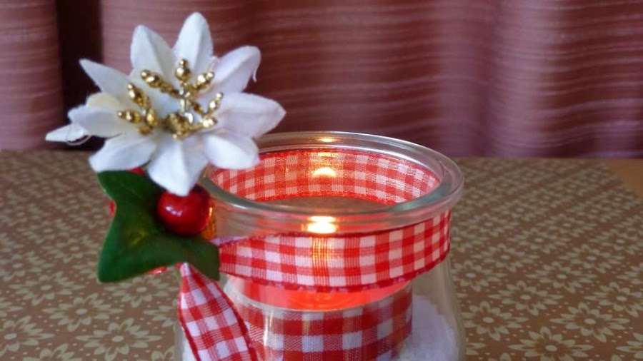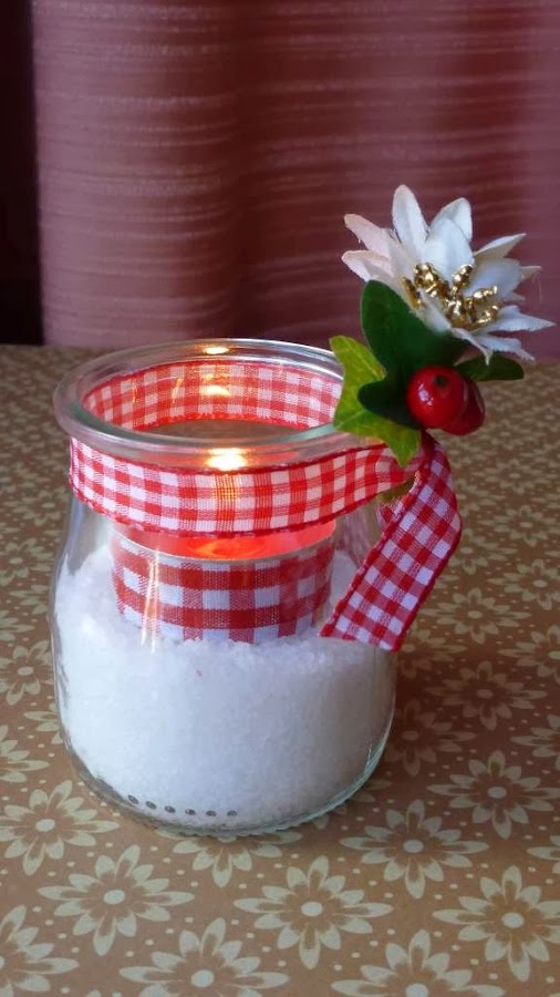 Necesitais un tarro de cristal (yo he utilizado pequeñitos de yogourt, pero puede ser cualquier tamaño con una forma que os guste. De ello depende el tamaño de la vela). Además, sal gorda, una vela, lazo de tela, o rafia, o cuerda de embalar que le dará un aire más rústico, pistola de silicona caliente y restos de adornos navideños. Si queréis, podéis forrar el envase de las velas pequeñitas con washi tape. Eso ya, al gusto: