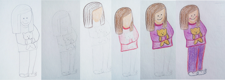 Primero volví a hacer el diseño y una vez que lo dibujé a lápiz, borré un poco la imagen, sólo para que el lápiz no se note tanto. Posteriormente, comencé a poner el color por el rostro y luego demás detalles.