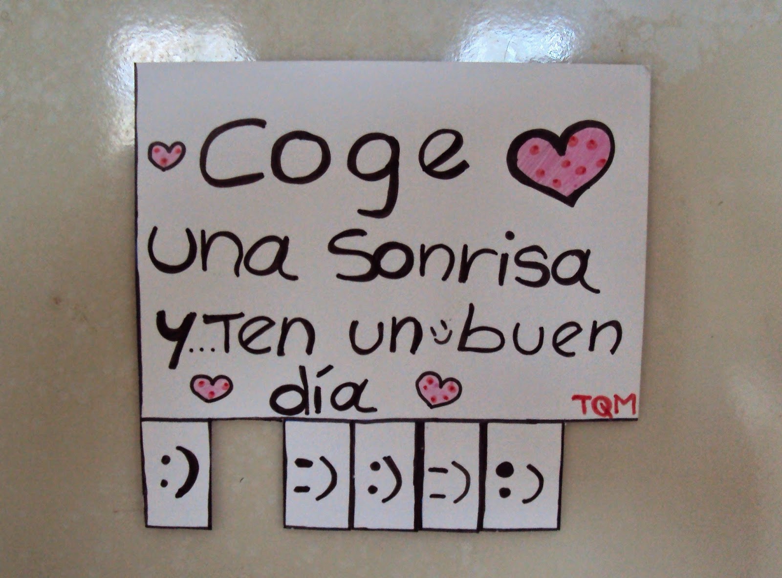He reciclado dos imanes de unos blocks de notas que tenía en la nevera y se me acabaron. Con el primero he recortado una cartulina (también reciclada) y le he puesto una nota original para sacar una sonrisa al que se acerque a mi nevera jeje.