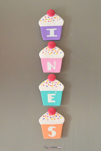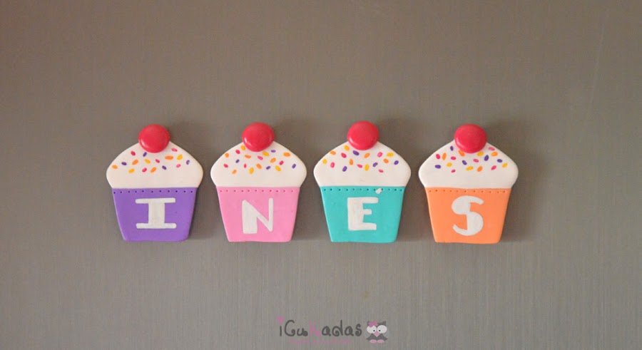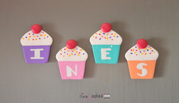Personalizados, de fimo, cada letra en un cupcakes, pueden ser todos del mismo color, o con colores variados, al gusto de cada comensal of course.