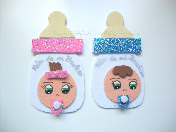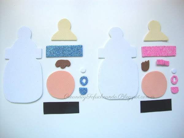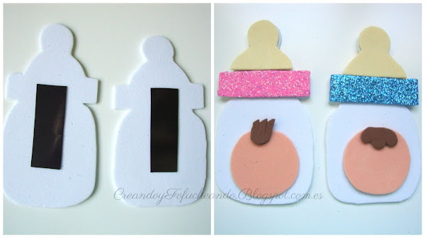 He preparado unos imanes con forma de biberones en goma eva plana,tanto para niño como para niña.