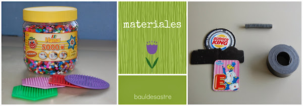 Los materiales que hemos empleado son muy conocidos: las famosas bolitas Hama o Pyssla de Ikea e imanes.