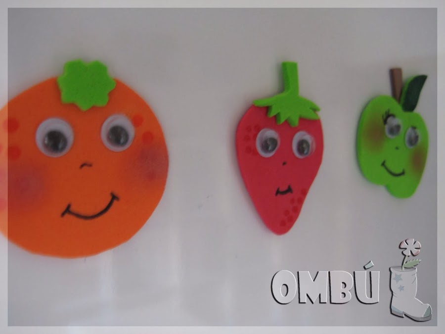 Por último, nuestra aportación, dos propuestas: una colección de imanes para "clasificar" las notas; algo para recordar, un recado.. y unas frutas divertidas de ojos saltones y muy coquetas.