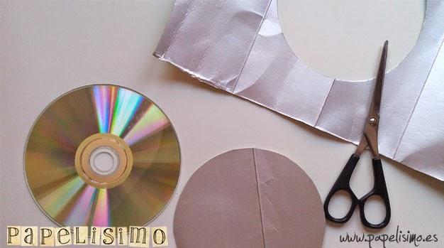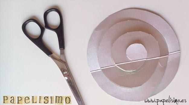 He usado un cartón de leche, con la misma técnica que con la flor enrollada de papel que he estado haciendo esta semana. Usamos un CD como plantilla para recortar flor haciendo un círculo y después una espiral que se enrollara sobre si misma.