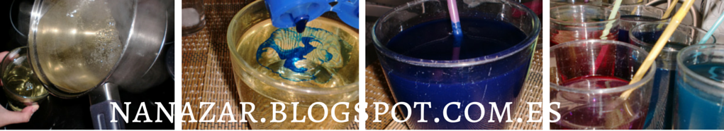 Después lo pondremos dentro de un recipiente, o de varios y para que coja color, utilizaremos tintes concentrados o superconcentrados para pinturas al agua. En mi caso utilicé azul y verde e hice mezclas entre ambos para conseguir colores intermedios. Además, lo bueno de estos tintes es que dependiendo de la cantidad que echéis podrá saliros tonos más claros o más oscuros. Así que con dos colores tendréis una gran gama.