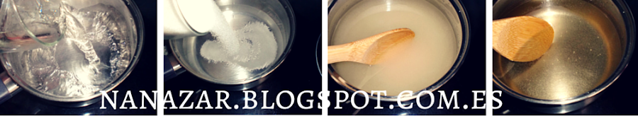 Con lo cual, echaremos en una olla agua y disolveremos totalmente el azúcar, que tiene que quedar como en la imagen de la derecha de la tira de abajo.