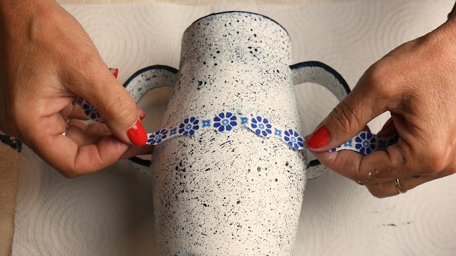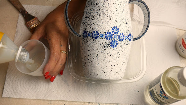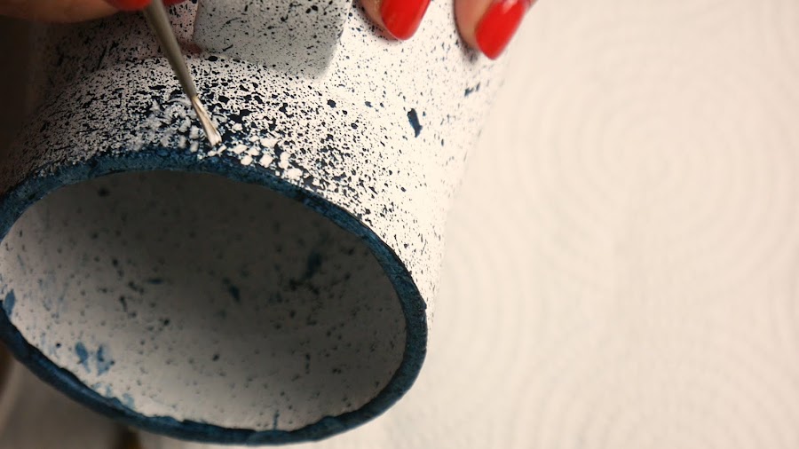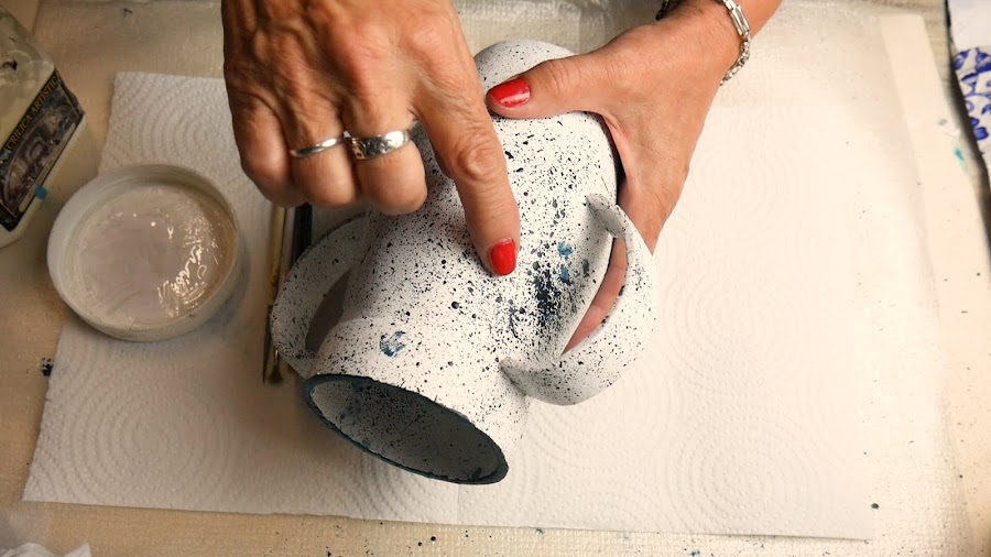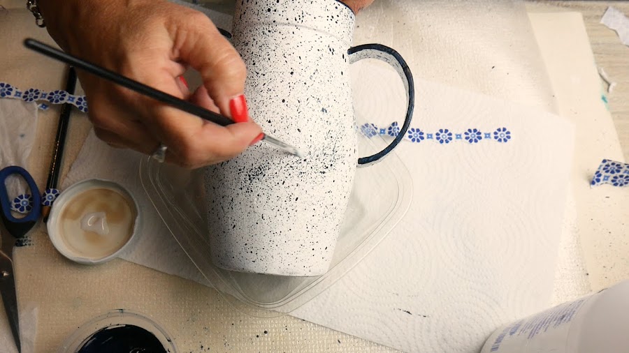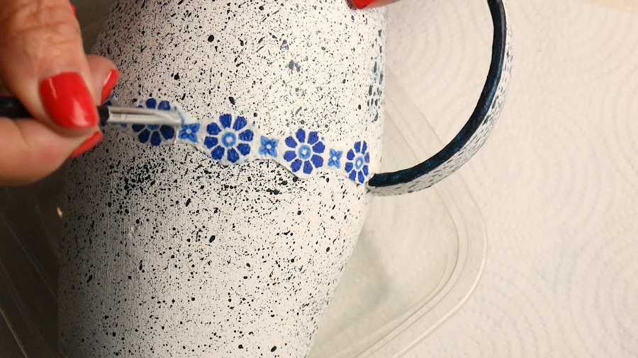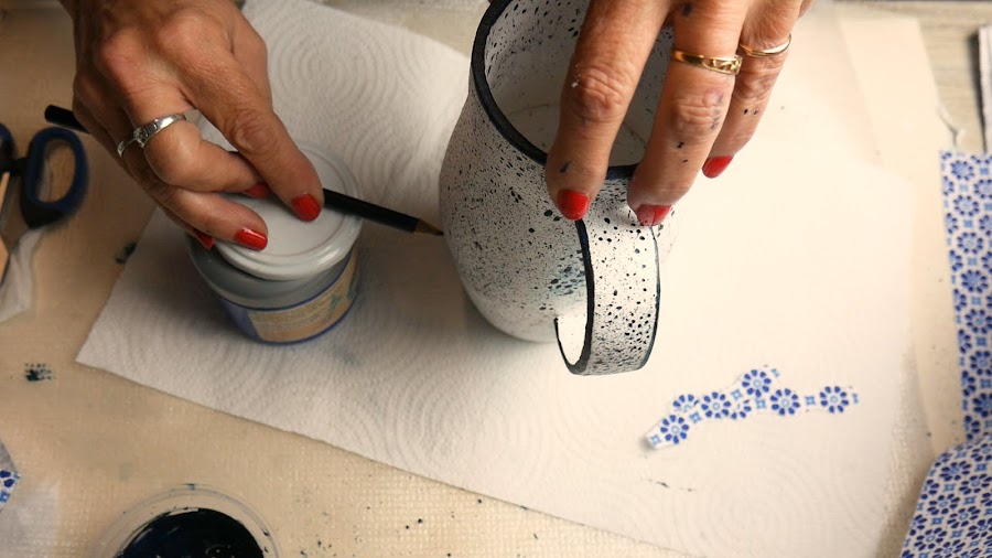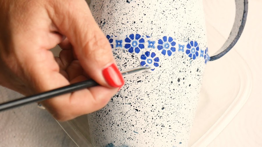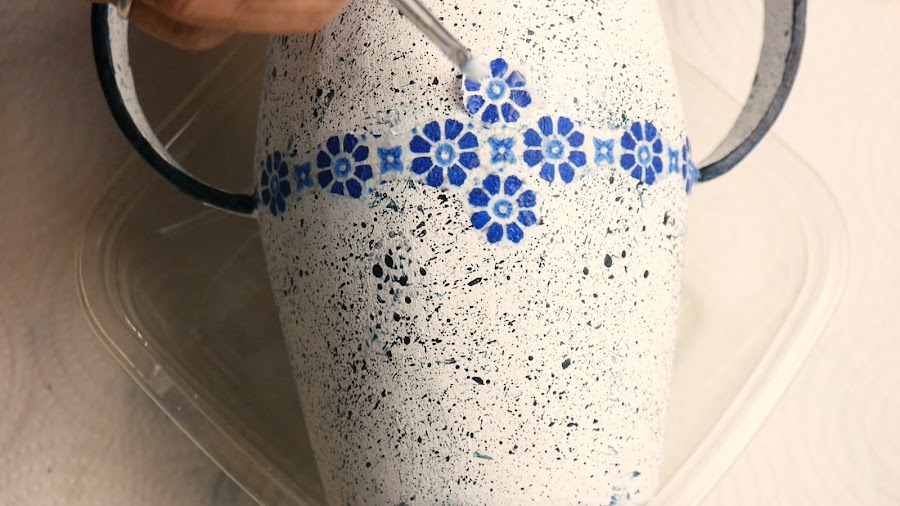 A medida que se seca retoco los bordes con azul hasta que queden bien cubiertos y con un pincel finito y pintura azul imito el salpicado en las zonas donde apliqué color blanco y también en todas las zonas donde creo que falto.
