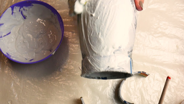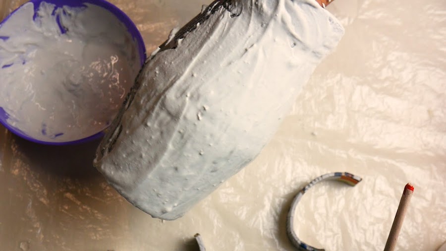 Terminada y seca la cartapesta voy a cubrir las piezas con una pasta, en mi caso voy a emplear pastina o tapajuntas que quedó de un trabajo que se realizó en mi casa.