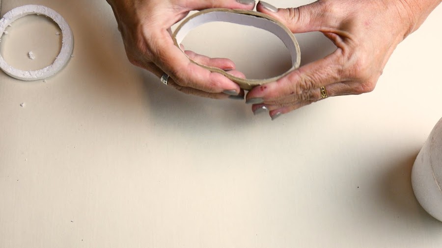Mientras éstas partes se secan voy a hacer las agarraderas con el otro aro de cartón, para ello lo aplasto para dividirlo por la mitad y lo corto en los dos extremos. me quedan así dos partes iguales.