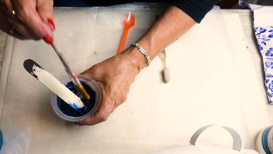 Mezclo y le voy agregando agua con el pincel para hacer la pintura más líquida.