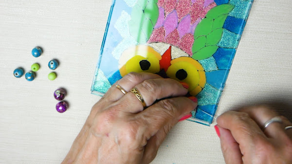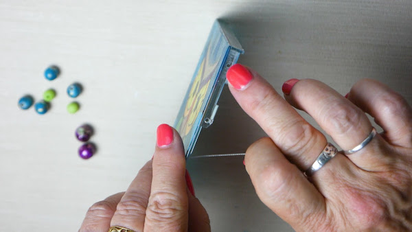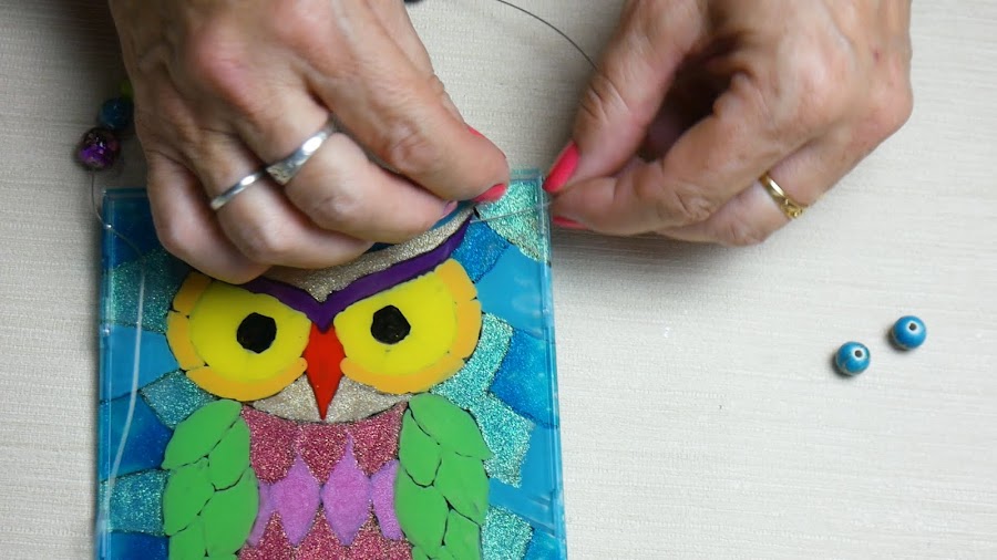 Paso el alambre por uno de ellos y por el otro extremo enhebro unos adornos que encontre que tienen colores parecidos a los del mosaico, y luego paso esta punta por el otro orificio y la uno con la anterior con un nudo.