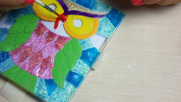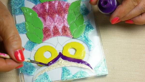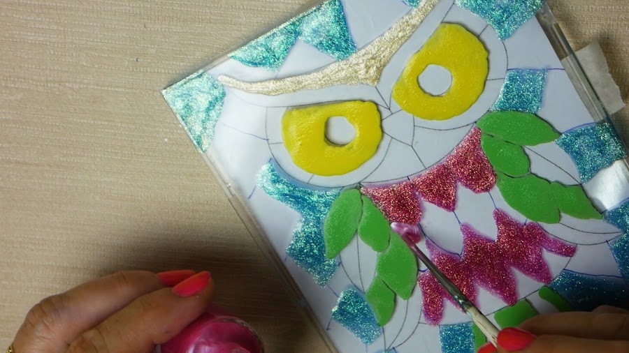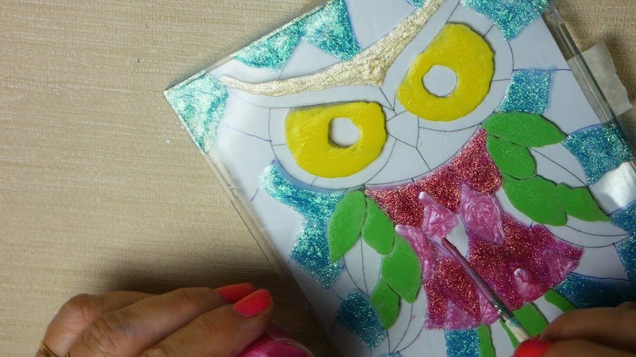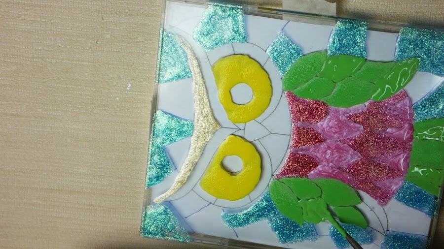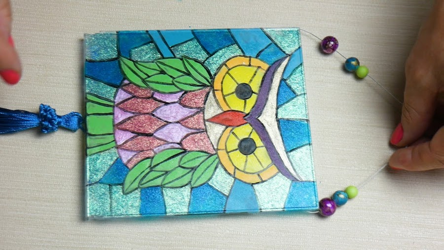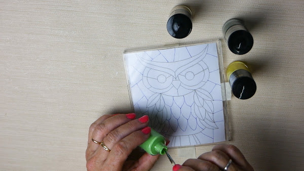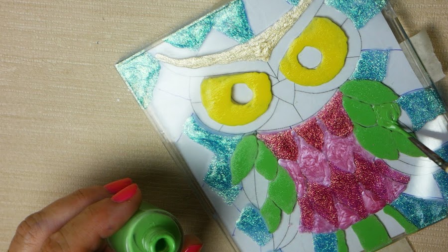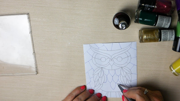 Cuando complete la pintura y se seco retiro el dibujo de atrás y con esmalte de uñas de color negro y un pincel liner o un pincel muy finito voy a hacer el delineado de separación de lo que serían los vidrios o mosaicos.