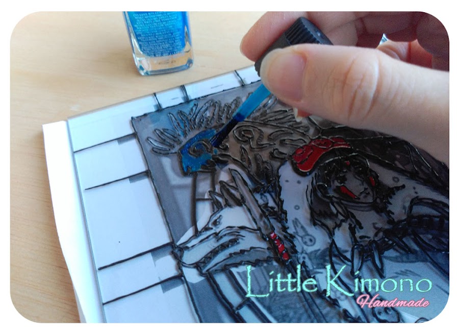 4. Como siempre digo... llega el momento más divertido, darle color! Con muuuucha paciencia iremos pintando con los esmaltes de uñas nuestra vidriera. Ya os había comentado que aplicando mucha cantidad los colores son más oscuros y con sólo una pasada quedan más claros ;)