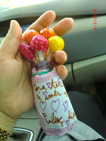 Me regaló unos chupa-chups, como si fuera un ramo "de flores" hecho con esos caramelos que vende la marca en cuestión. Y como no, con su notita correspondiente... aissss.... es un amor! Siempre me saca una sonrisa, a todas horas. Es un niño especialmente cariñoso y detallista. Y quiero que perdure ese momentazo en mi particular bitácora que es este blog. :")