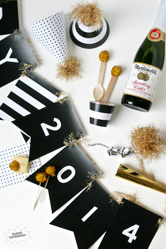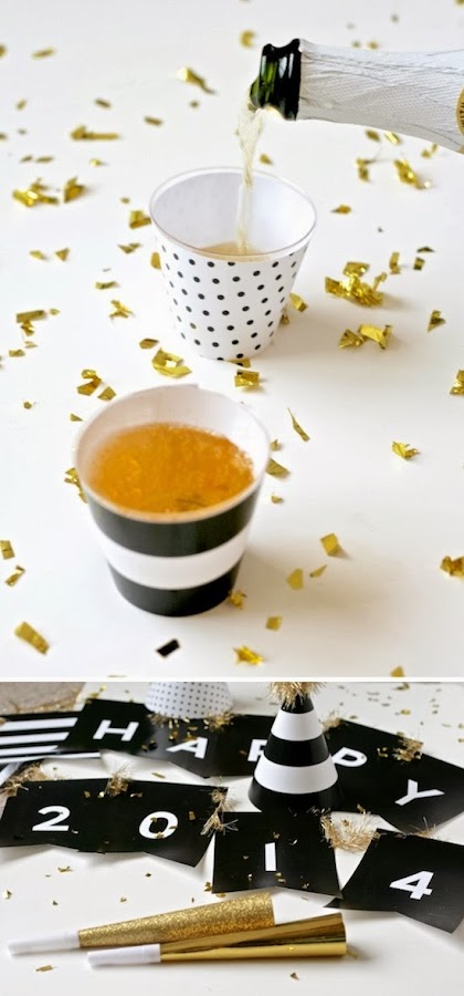 Este kit de fiesta de Fin de Año de Paging Supermom es super chulo. Gorritos, guirnalda de banderines y etiquetas para los vasos en blanco y negro, con dos fantasías: a lunares y a rayas. Si agregáis algunos toques dorados quedarán geniales. Podéis descargar todo el set aquí.