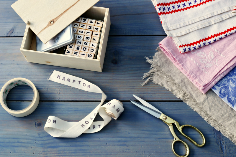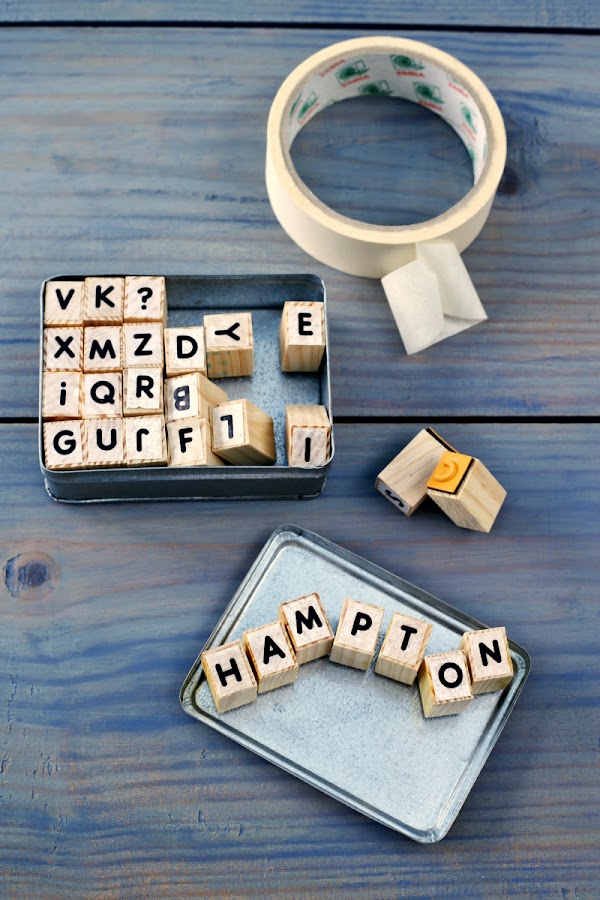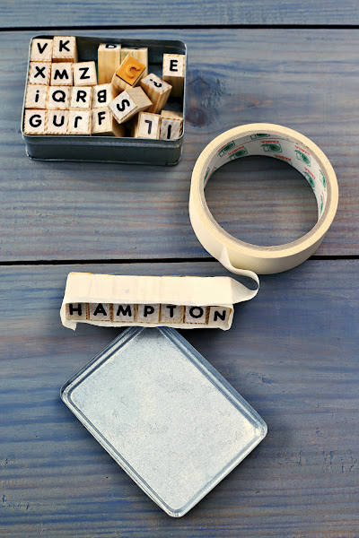Como el nombre de mi blog no tiene letras repetidas compuse la palabra HAMPTON con los sellos de un abecedario, uniendo las letras con cinta de carrocero, de modo que pude estampar la palabra en bloque, resultando más fácil y favoreciendo un resultado más uniforme.
