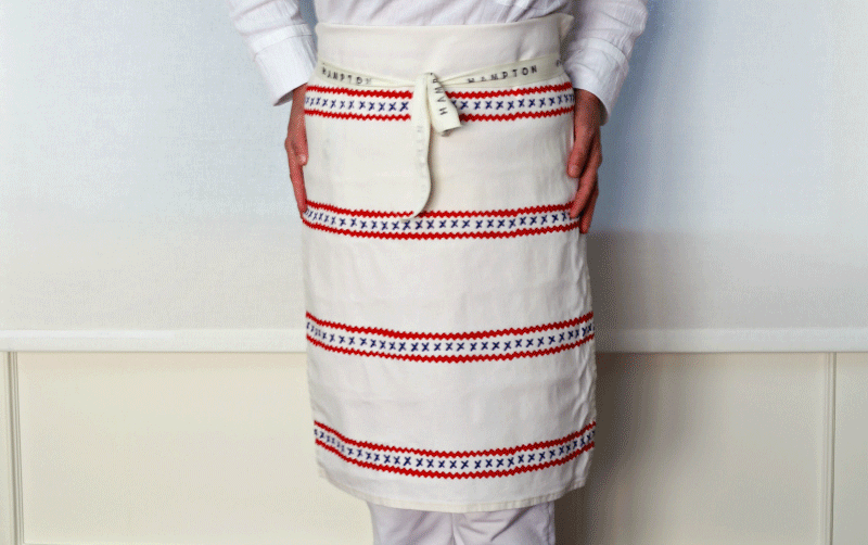 Doblamos el trozo superior y nos colocamos el delantal, dando una vuelta completa a la cinta sobre nuestra cintura para anudarla delante.