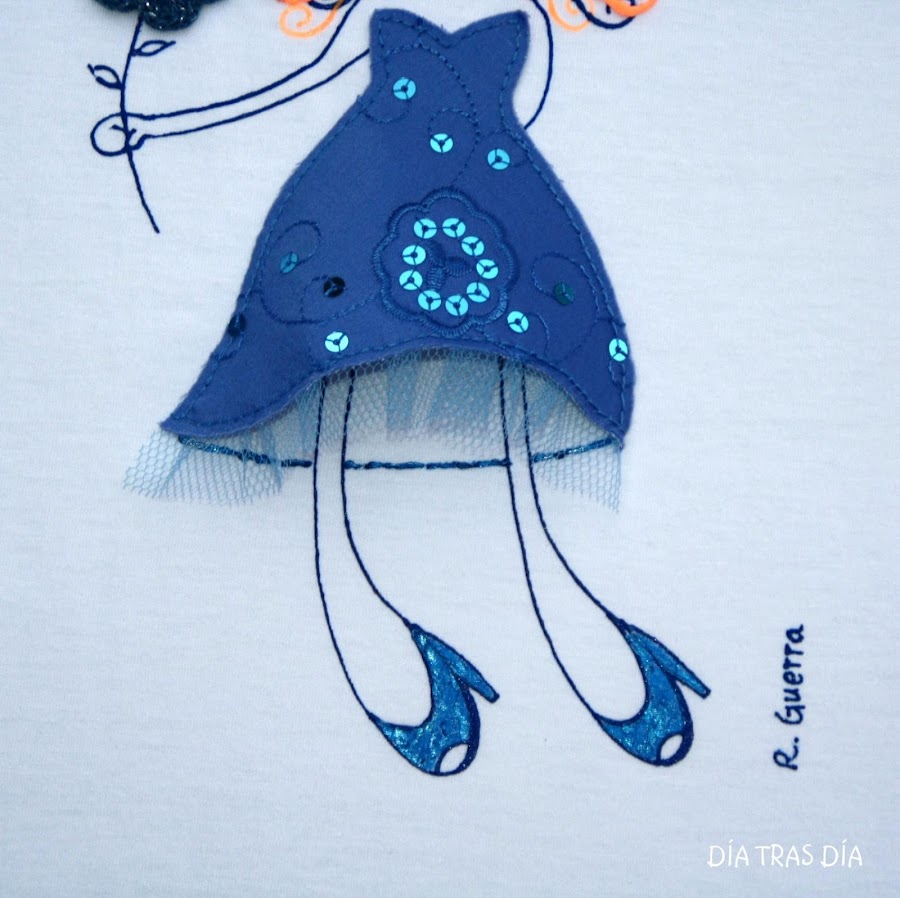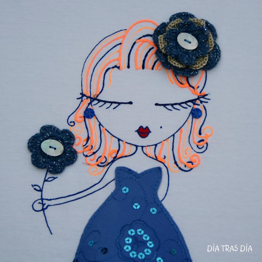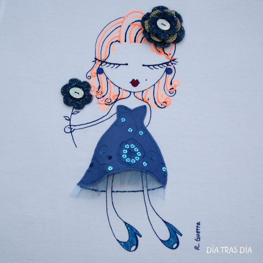 Esta camiseta fue un encargo que me hizo Agurne justo a principios de verano. Me dijo que le encantaba este modelo, pero que si era posible, le gustaría que fuese con el vestido y los complementos en tono azul eléctrico, ya que es su color favorito. Pues ya que así me lo pidió, hice lo posible por acertar con sus gustos, y este fue el resultado:
