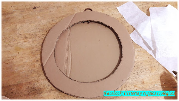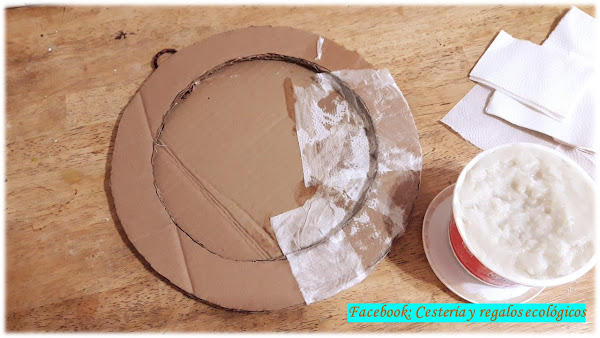 Para reforzar la pieza de cartón, pegamos 2 capas de pedazos de servilleta de papel o de papel higiénico, pegamos con una mezcla aguada de pegamento o cola blanca común y agua, o con engrudo casero...