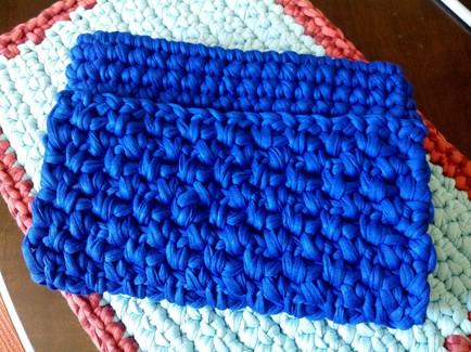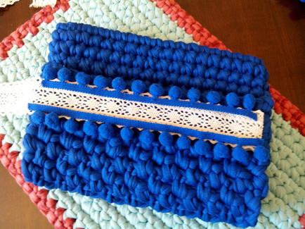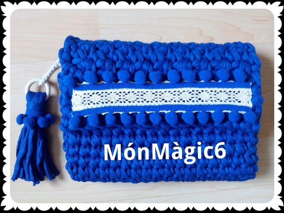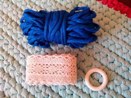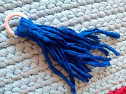 Para decorar nuestro Clutch le añadiremos una borla hecha con trapillo y una argolla de madera. (Si no tenéis argollas de madera podéis usar metálicas o simplemente usar otra tira de trapillo)