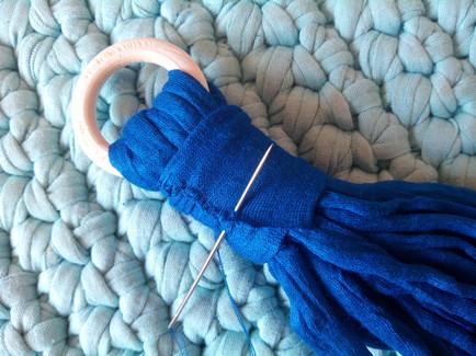 Cortamos varias hebras de trapillo y las introducimos en nuestra argolla justo a la mitad, luego las cosemos todas juntas para formar la borla