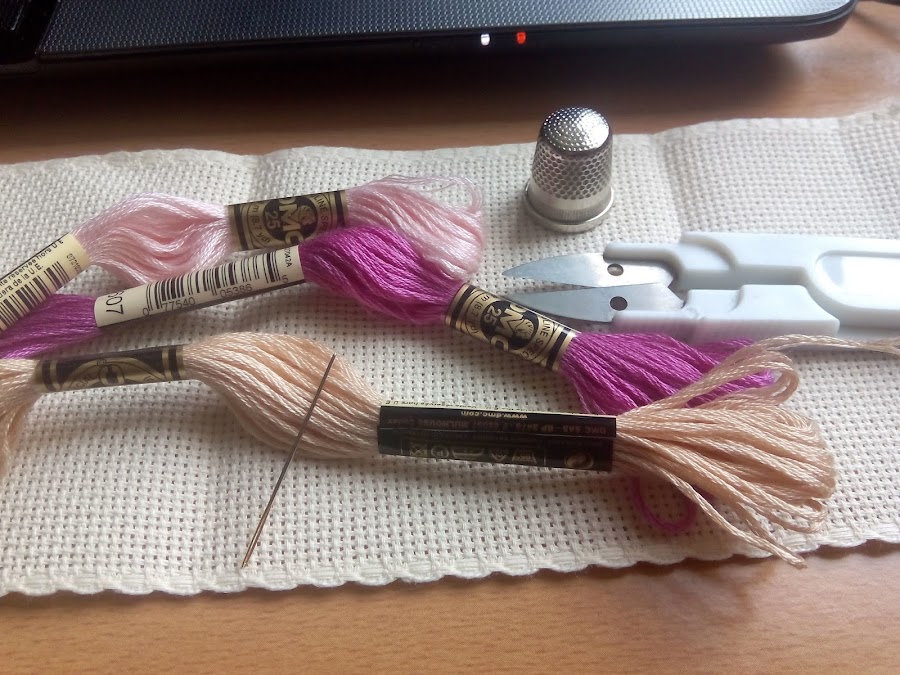 Lo primero la base donde irá el bordado, para empezar recomiendo tela Aida, se ve mejor el entramado para hacer las cruces. Un dedal, porque como dice el refrán, "costurera sin dedal, cose poco y mal" ;) A mi me costó acostumbrarme a él, ahora no sé coser si no me lo pongo, pero vamos que como mejor os apañeis. Una aguja, recomiedo las de punta roma, os asegurareis pinchar en el agujero y no en la trama. Unas tijeras o cortahilos y como no... los hilos.