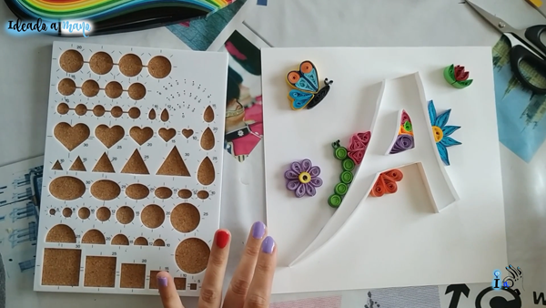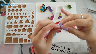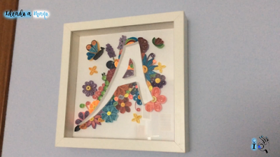 Así vamos poco a poco rellenando todos los huecos que quedan alrededor de la letra, con flores y otros motivos. Haciendo las formas necesarias para llenar los huequitos... Y cuándo hemos acabado la podemos poner en un marco con profundidad y mirad qué bonita queda!