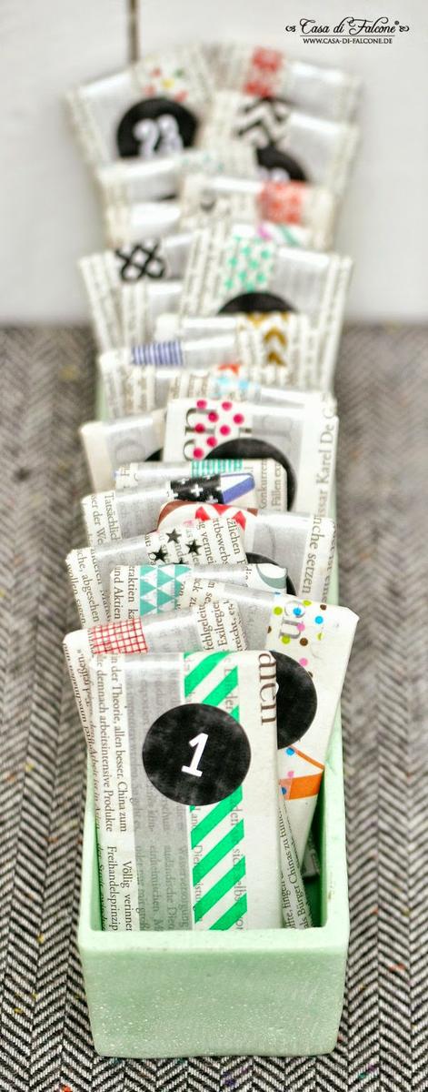 :: Tabletas de chocolate envueltas en papel de periodico y washi tape