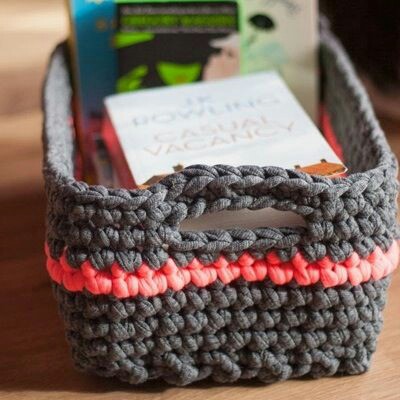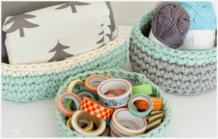 Otra opción de decoración para el hogar hecha de trapillo son los cestos que hay de todas las maneras, colores y tamaños y sirven para tener ordenados desde los jugetes de los peques, o como revistero, o como organizador de los cajones del baño.