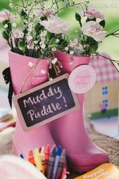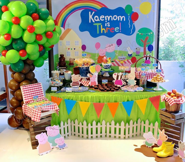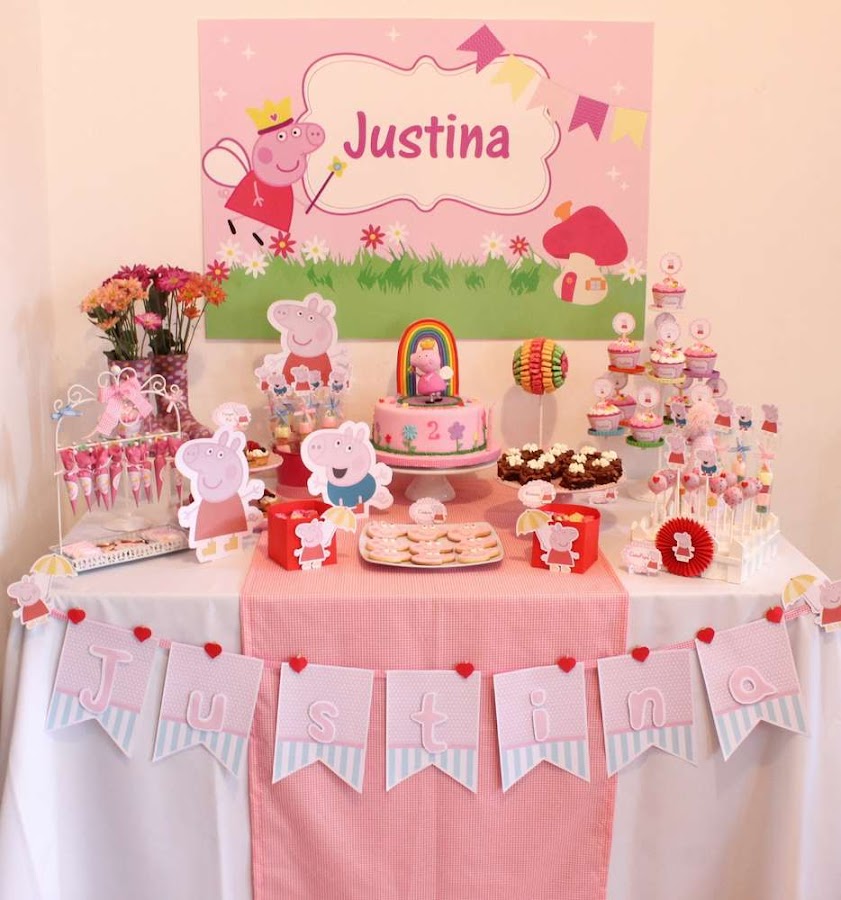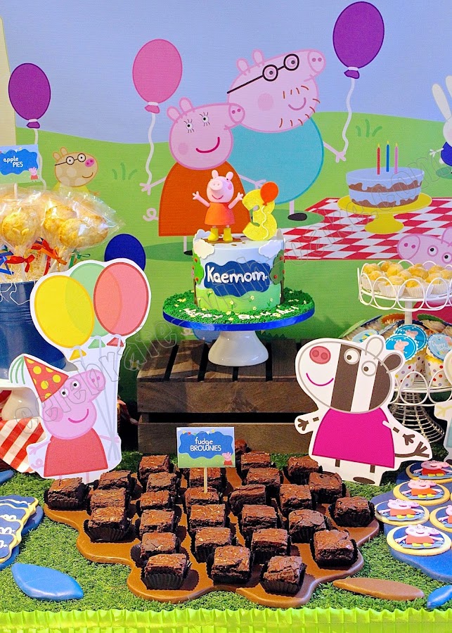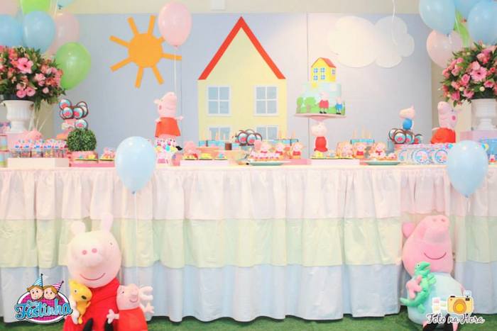 Todo muy pastel, con peluches de pepa y su hermanito, tambie hay flores.