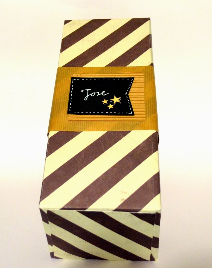 - Envolví un regalo con papeles de scrapbooking (y, aunque lo parezca, no es una botella de whisky). Colores muy discretos porque el destinatario es un hombre. Podemos encontrar ideas en el blog de Monimanitas.