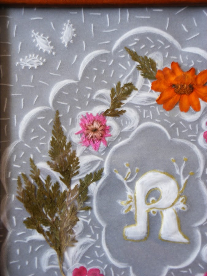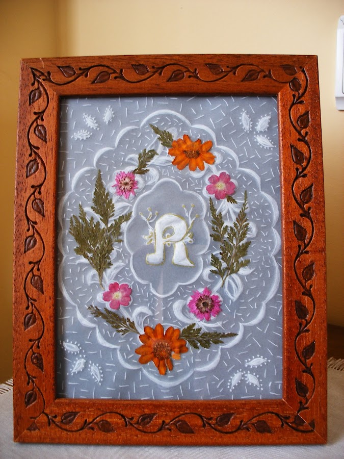 Y por último el pretexto del inter........ jejjeje......... El cuadro con flores secas........ Con su fondo de pergamano.......... PRECIOSOOOOOOOOOOO...y con suerte lleva mi inicial porque ya le había salido "algún novio"........