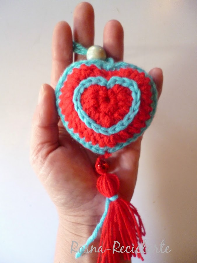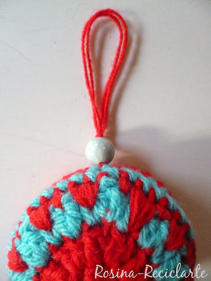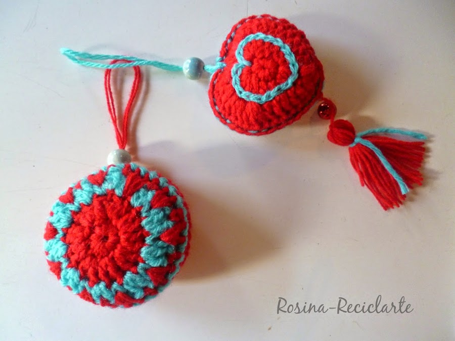 El segundo( pero no el último) regalito debe ser algo para el árbol de navidad, así que usé mis restos de lanitas y tejí un corazón y una pelotita..