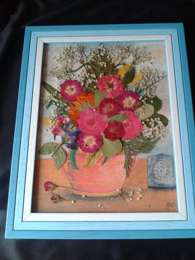 Este es el cuadro con flores y hojas secas que le hice, la mayoría de ellas están sin pegar, con el fin de que las pueda aprovechar para otros trabajos y el marco a su vez le sirva para poner alguna foto...