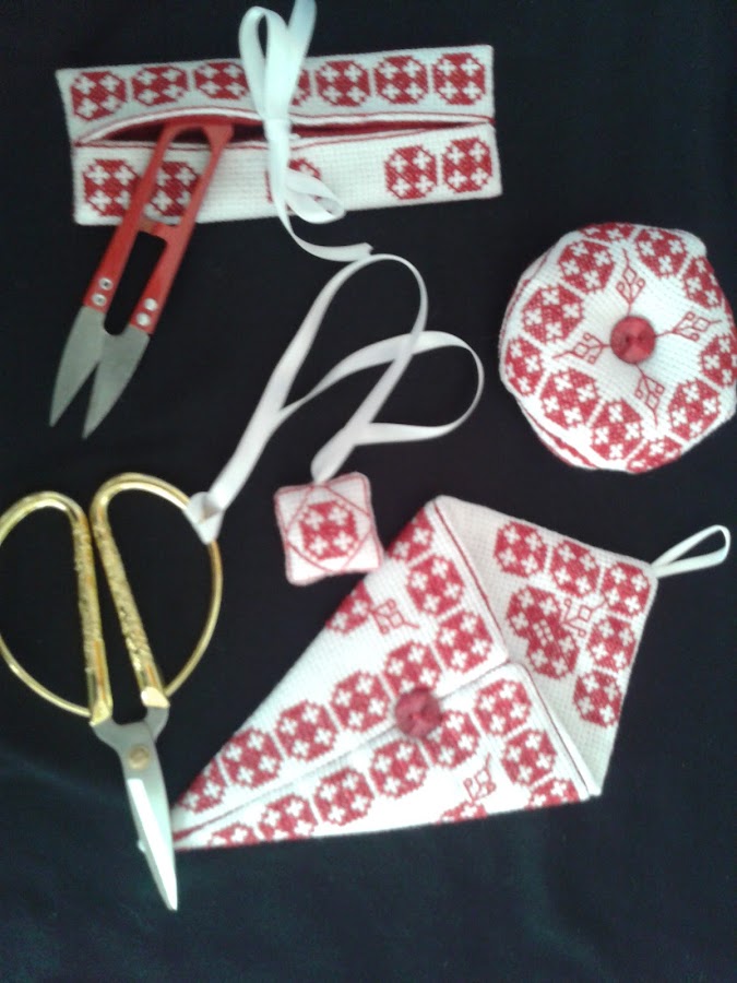 Y como no podía ser de otra manera, un juego de biscorniu, guarda tijeras, fob y funda para que guarde el corta hilos. Todo hecho a punto de cruz