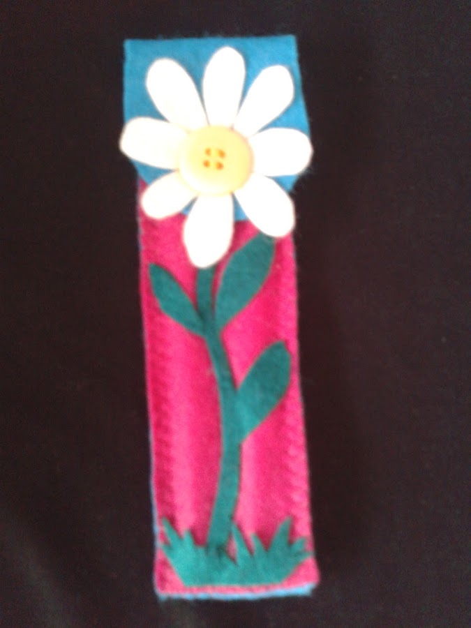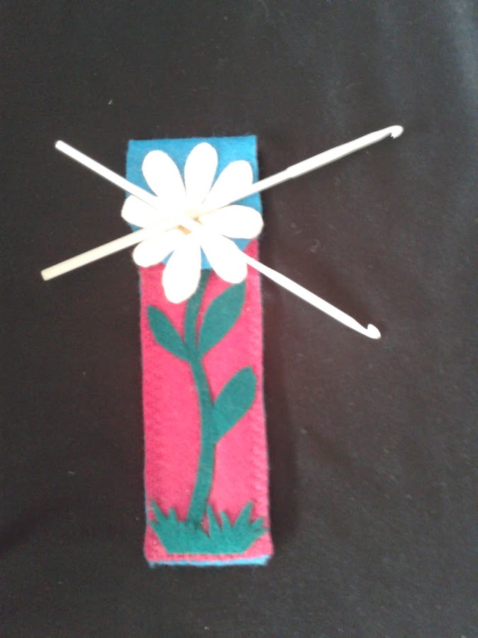 Para que guarde sus ganchillos, que sé le gusta hacer flores y broches.Le hice con fieltro esta especie de bolsita,adornada con una margarita, haciendo honor a su nombre