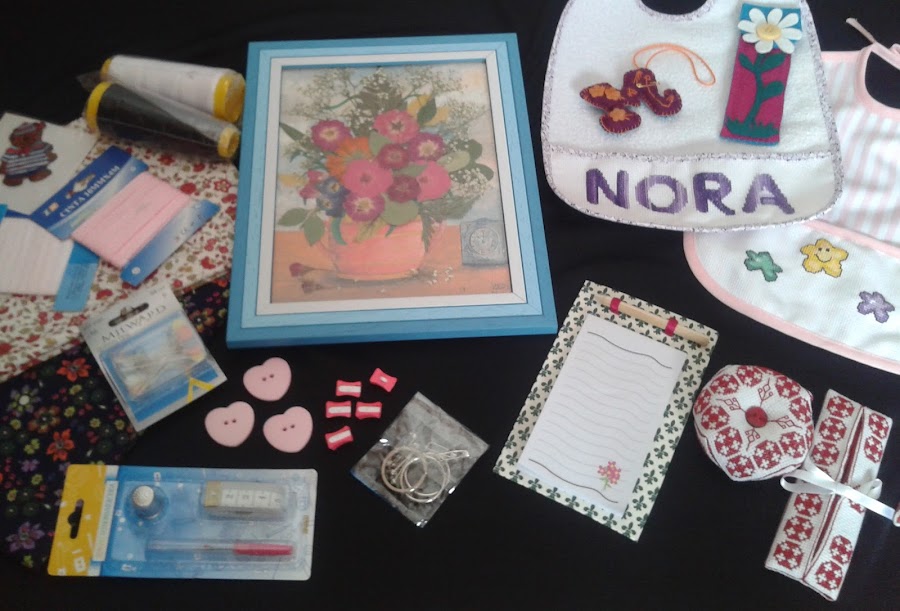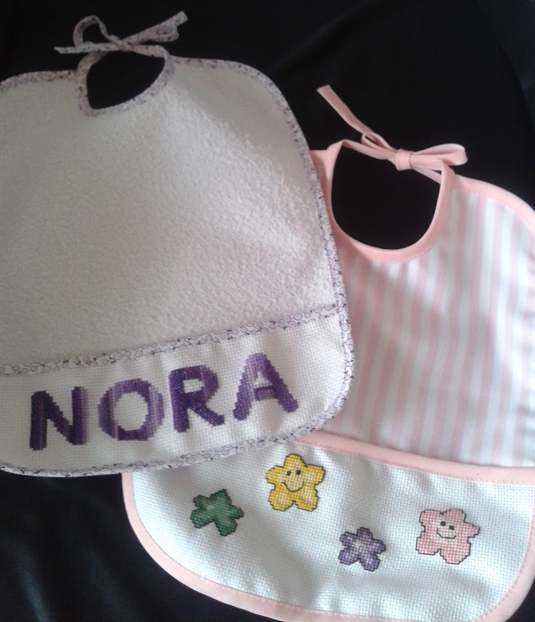 Y ahora un atrevimiento por mi parte, pues al "investigarla" supe que tenia una nieta llamada Nora, y no pude resistirme a hacerle un par de baberos a punto de cruz.