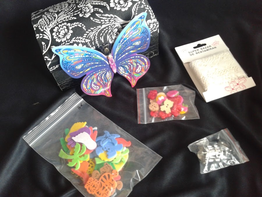 Una super mariposa ,una puntilla, un montón de botones, unas pegatinas de muchas formas y un llavero en forma de jaulita plateada.