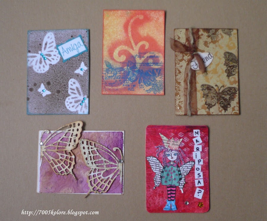 Los Atc son pequeñas obras de arte que los artistas intercambian entre si. Yo he participado en uno de ellos, y mi contribución al intercambio ha sido está,lo titule "los sueños pueden hacerse realidad" son pequeñas tarjetitas de 9*13 aproximadamente, hechas en cartulina azul, a las que aplique unas mascaras caseras de mariposas, en un lateral aplique a modo de puntilla un recorte de la ...