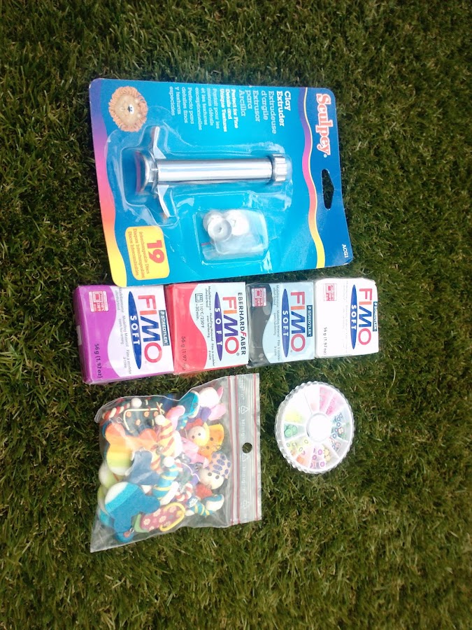 un poco de fimo, una churrera y unas mini figuras de frutas cortadas ( las figuritas de la izquierda tambien iban en el inter, que por cierto le he pedido mas para los inter).
