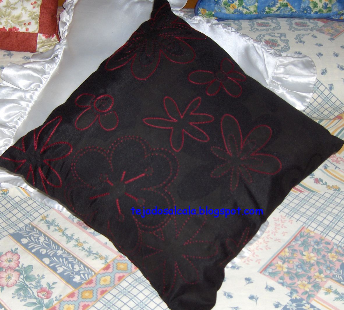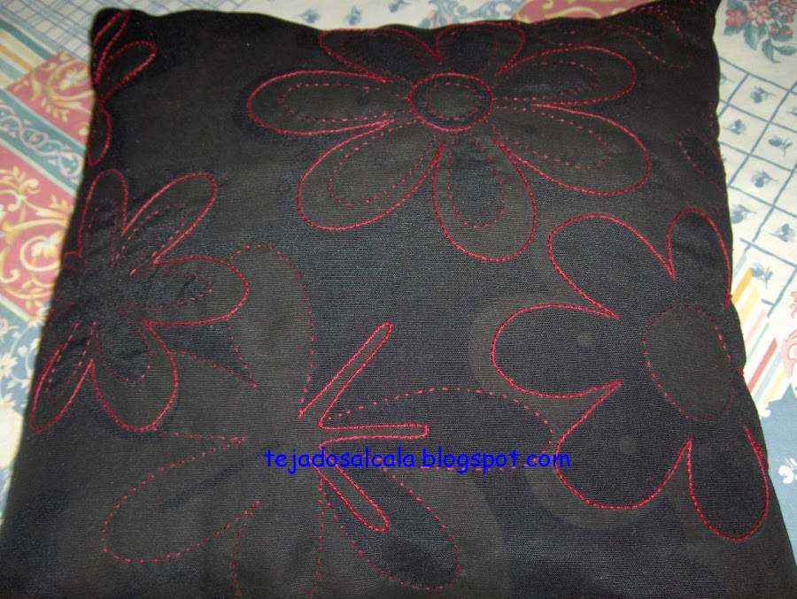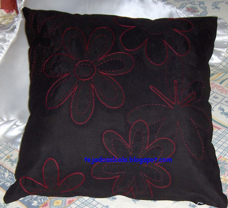 A mi me tocó enviar a Gloria , la verdad es que no sabía que hacer y al final se me encendió la bombilla. Un día de compras vi un cojín con unas flores serigrafiadas, era negro y apenás se veian las flores así que borde los contornos de las flores con pespuntes, cadenetas y punto de tallo y quedo un cojín original y único. espero que le gustara. Yo me divertí mucho bordandolo. Así me quedó por ambos lados