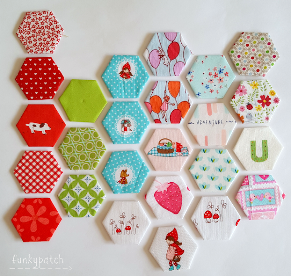 Estos son los hexágonos que le hice, utilicé varias telas de diseñadora que se que le gustan, como Tasha Noel, Amy Sinibaldi, Aneela Hoey y Sarah Jane. Me pareció bonito hacerle un hexágono con la inicial de su hija Uxía.