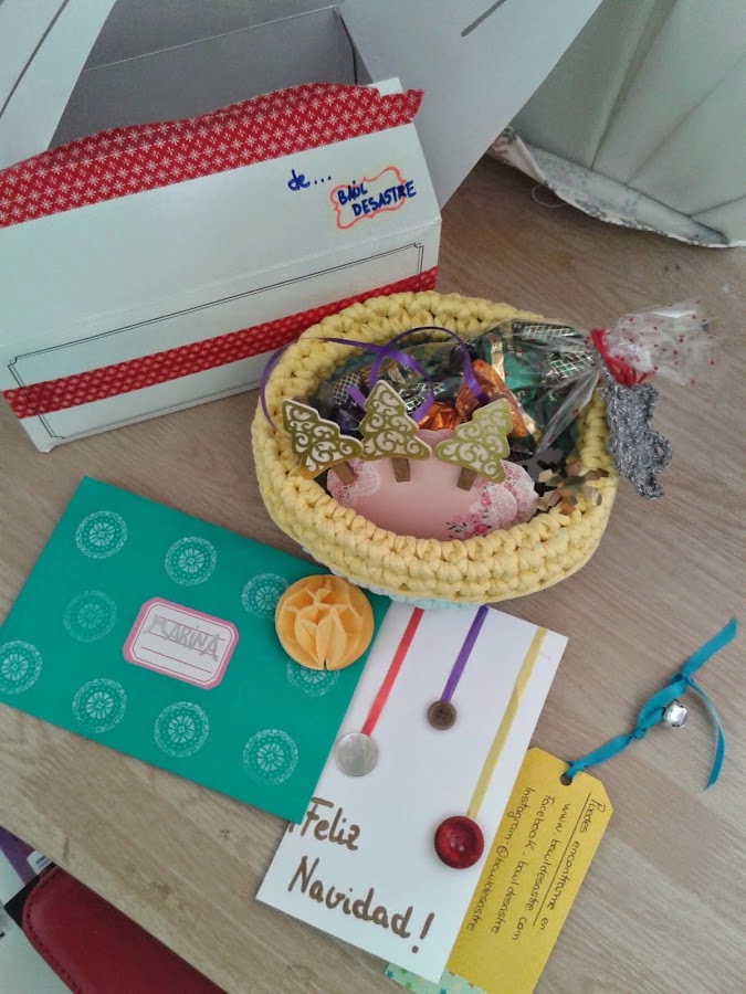 ¡Y esto es lo que trae! Una cestita hecha de trapillo, muy mona, bombones, una postal navideña y una guirnalda de árboles hecha con pinzas. ¡Me ha encantado!