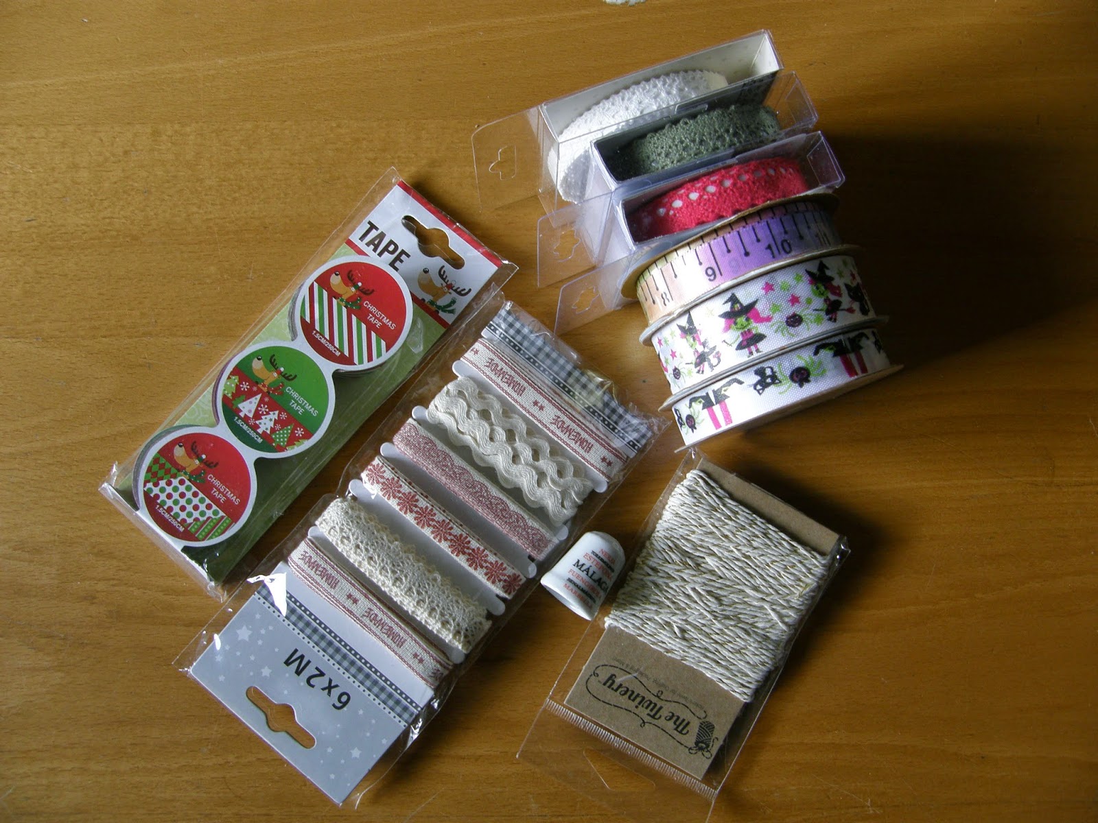Un buena colección de puntillas, cintas, washi, cordones de lo más variado y un dedal, de letras, de Malaga.