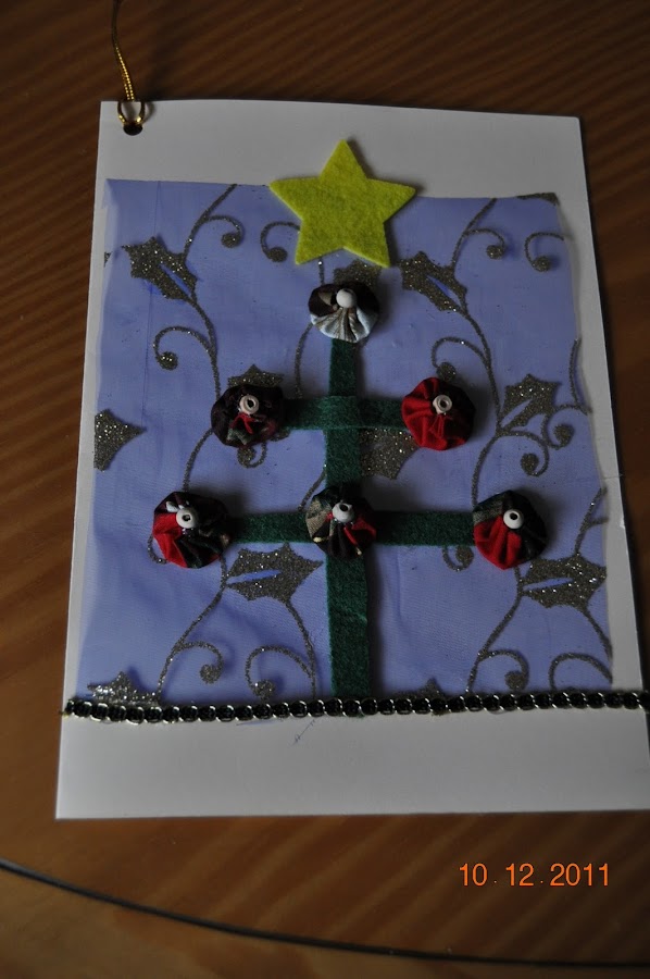 Y mi primera tarjeta de Navidad de este año, realizada con fieltro y tela y cartulina, claro.